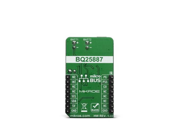 Balancer 5 Click is based on the BQ25887 form Texas Instruments- fully integrated 2-cell Li-ion battery charger IC ideal for portable applications with cell balancing. The BQ25887 optimizes the charging two battery with balancing. The input voltage range from USB connector can be as high as 5.5V, battery can be charge with up to 3.3A. When the input voltage exceeds the OVP (Over Voltage Protection) threshold, it will turn off the charging MOSFET to avoid overheating of the chip. Along with its small physical size, the low number of external components makes this IC ideally suitable for various applications.