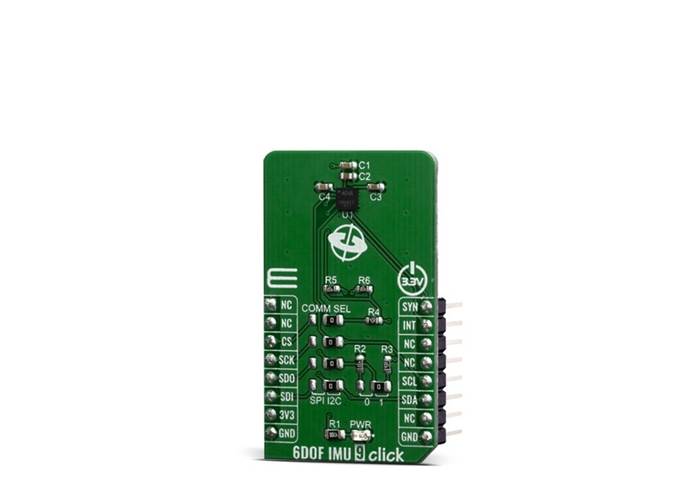 The 6DOF IMU 9 Click is a Click board™ which features the IAM-20680, a 6-axis MotionTracking device that combines a 3-axis gyroscope and a 3-axis accelerometer, from TDK InvenSense. A combination of the two most commonly used motion sensors allows for full 6D sensing. Tailored towards the Industry 4.0 This Click board™ can be used for automotive applications and navigation systems aids for dead reckoning, lift gate motion detection, accurate location for vehicle to vehicle and infrastructure, 360º view camera stabilization, car alarm, telematics and insurance vehicle tracking.