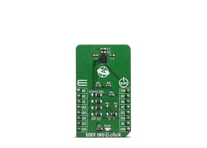 6DOF IMU 9 Click supports both SPI and I2C communication interfaces, allowing it to be used with a wide range of different MCUs. The communication interface can be selected by moving SMD jumpers grouped under the COM SEL to an appropriate position (SPI or I2C). The peripheral I2C address can also be configured by an SMD jumper when the Click board™ is operated in the I2C mode an SMD jumper labelled as ADD LSB is used to set the least significant bit (LSB) of the I2C address.