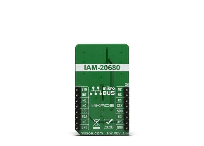 The 6DOF IMU 9 Click is a Click board™ which features the IAM-20680, a 6-axis MotionTracking device that combines a 3-axis gyroscope and a 3-axis accelerometer, from TDK InvenSense. A combination of the two most commonly used motion sensors allows for full 6D sensing.