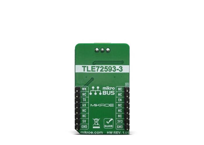 The LIN Click is a Click board™ that features the TLE7259-3GE, a LIN transceiver from Infineon Technologies, with integrated wake-up and protection features.