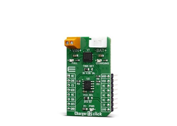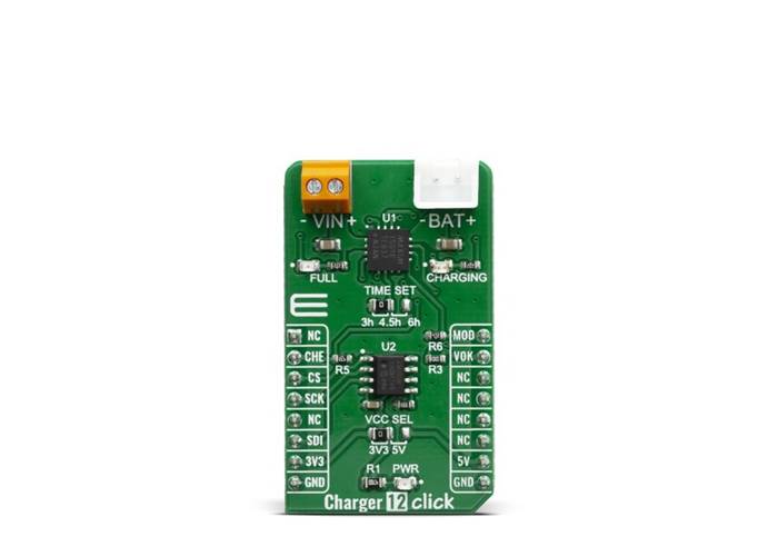 Charger 12 Click is a single lithium-ion (Li+) cell or three-cell NiMH/NiCd battery charger. This Click can be used for Low-Cost Li-Ion battery chargers, or Power Tools, toys, backup energy storage solutions, etc.