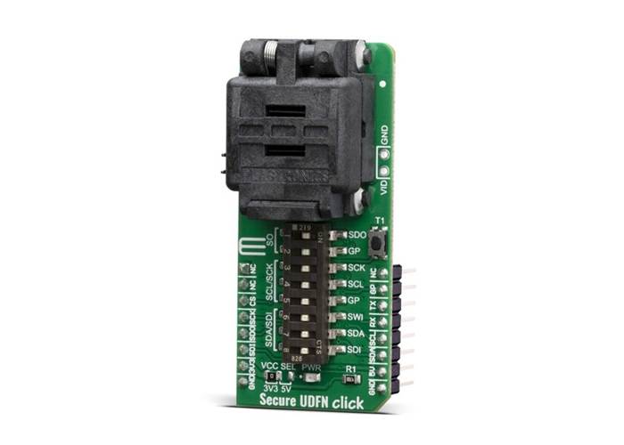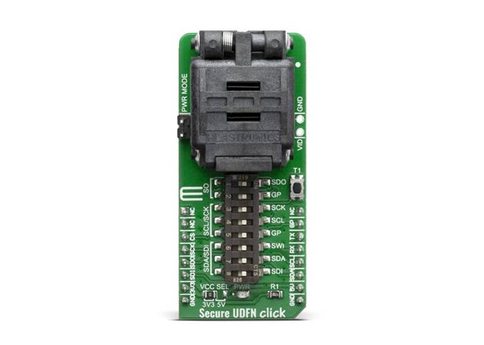 Secure UDFN Click includes the 08QN50L43020, an universal socket for 8-pin UDFN packaged integrated circuits. The Click board™ is designed with support for CryptoAuthentication™ devices from Microchip in mind. These CryptoAuthentication™ devices are equipped with many different features, such as EEPROM array, certificates, consumption logging, security configurations and other types of secure data. Secure UDFN Click, supports the I2C, SPI, and SWI communication interfaces with a flexibility that allows use in various security applications, including Network/IoT Node Endpoint Security, Secure Boot, Small Message Encryption, Key Generation for Software Download, Ecosystem control, Anti Counterfeiting and similar.