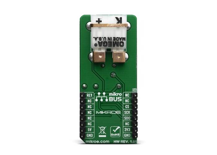 Depending on the temperature information obtained over the SPI interface, the host MCU can take the necessary action: it can either open or close contacts of the relay. The Click board™ uses the G6D series PCB power relay, from Omron. This quality relay can withstand an amazingly large number of mechanical cycles, with no load connected. However, when there is a significant load connected at its output, micro-electric arcs cause the contacts to wear over time. With the maximum load current of 5A, it can sustain up to 70,000 cycles. Its contacts are made of silver alloy, yielding exceptional ON resistance of only 100mΩ (max).