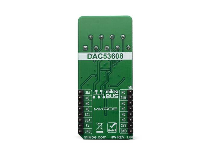 Low quiescent current, wide power supply range, and per channel power down option makes DAC53608 ideal for low power, battery operated system. The device communicates through I2C interface. These devices support I2C standard mode (100 Kbps), fast mode (400 Kbps) and fast+ mode (1 Mbps). These devices also have a load DAC (LDAC) pin that allows simultaneous DAC updates. LDAC pin is tied with a mikroBUS™ PWM pin. The I2C lines (SCL and SDA) are routed to the dedicated mikroBUS™pins.