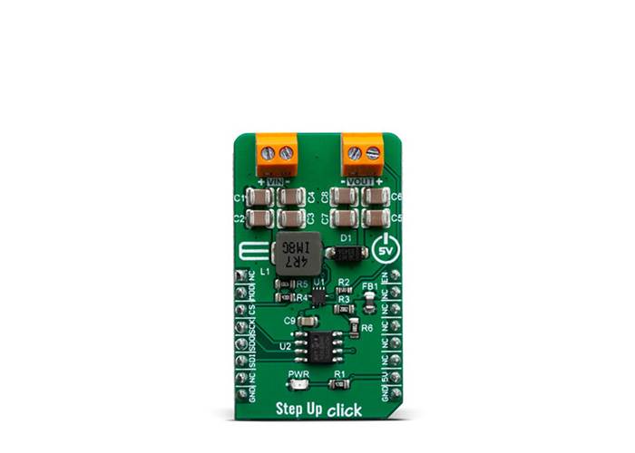 Step Up Click is a fixed frequency DC-DC step-up (boost) regulator, which can be obtained from any low voltage input - such as NiCd, NiMH or one cell Li-Po/Li-Ion batteries. This Click features very high efficiency, low noise and anti-ringing voltage output and inrush current limiting with the internal soft-start, as well as true disconnect option for minimised power drain, when in shutdown mode. These features allow this device to be used as the power source for various battery-operated devices, such as microcontrollers, various portable embedded electronic devices, handheld instruments, GPS modules, or various battery-operated USB emergency backup chargers. Very good switching efficiency factor ensures prolonged battery life for any application this device is used in.