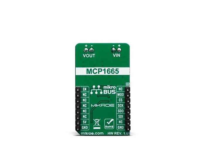 Step Up Click utilizes the MCP1665, a 500 kHz, compact, high-efficiency, fixed-frequency, nonsynchronous step-up DC-DC converter that integrates a 36V, 100 mΩ NMOS switch, from Microchip. This IC is targeted towards boosting the voltage from NiCd, NiMH, Li-Po/Li-Ion batteries and as such it has a great efficiency factor, that allows for prolonged battery life. The MCP1665 IC uses the fixed switching frequency of 500 kHz and has the overvoltage protection to ensure safe operation.